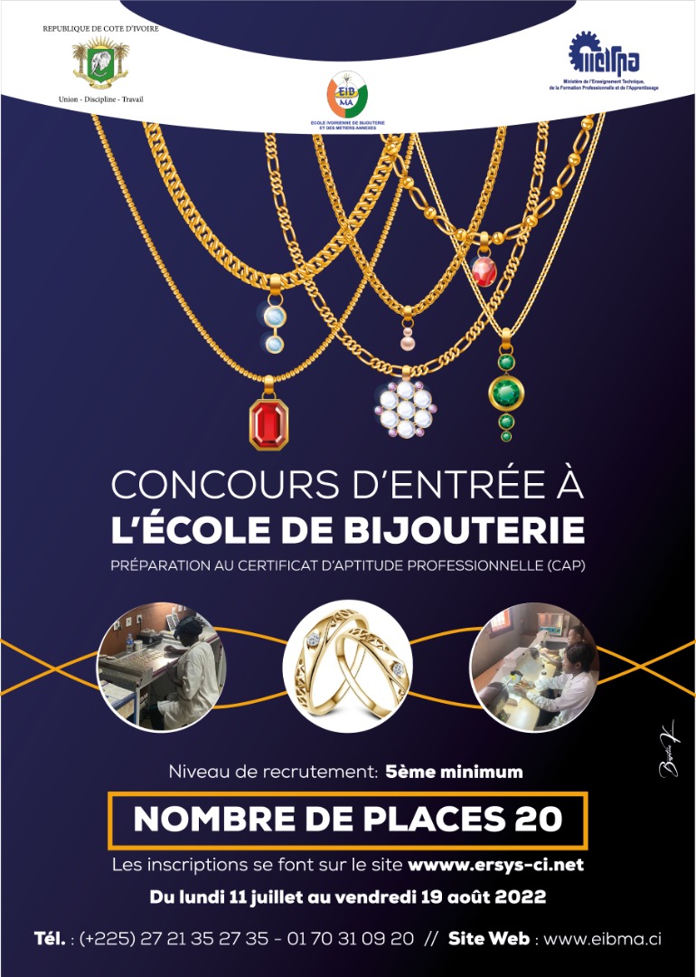 Jeunes de Côte d’Ivoire qui rêvez d’entrer dans l’univers fabuleux et féerique de la bijouterie et de ses métiers annexes, l’EIBMA est à votre portée. Chers concitoyens, à l’EIBMA, l’œuvre du bijoutier cesse d’être un objet approximatif pour devenir un joyau, résultat du respect des normes et la parfaite maîtrise de l’art de façonner et de tailler. Désormais, bijoux, médailles de décoration, pins et trophées n’auront qu’un label : EIBMA.