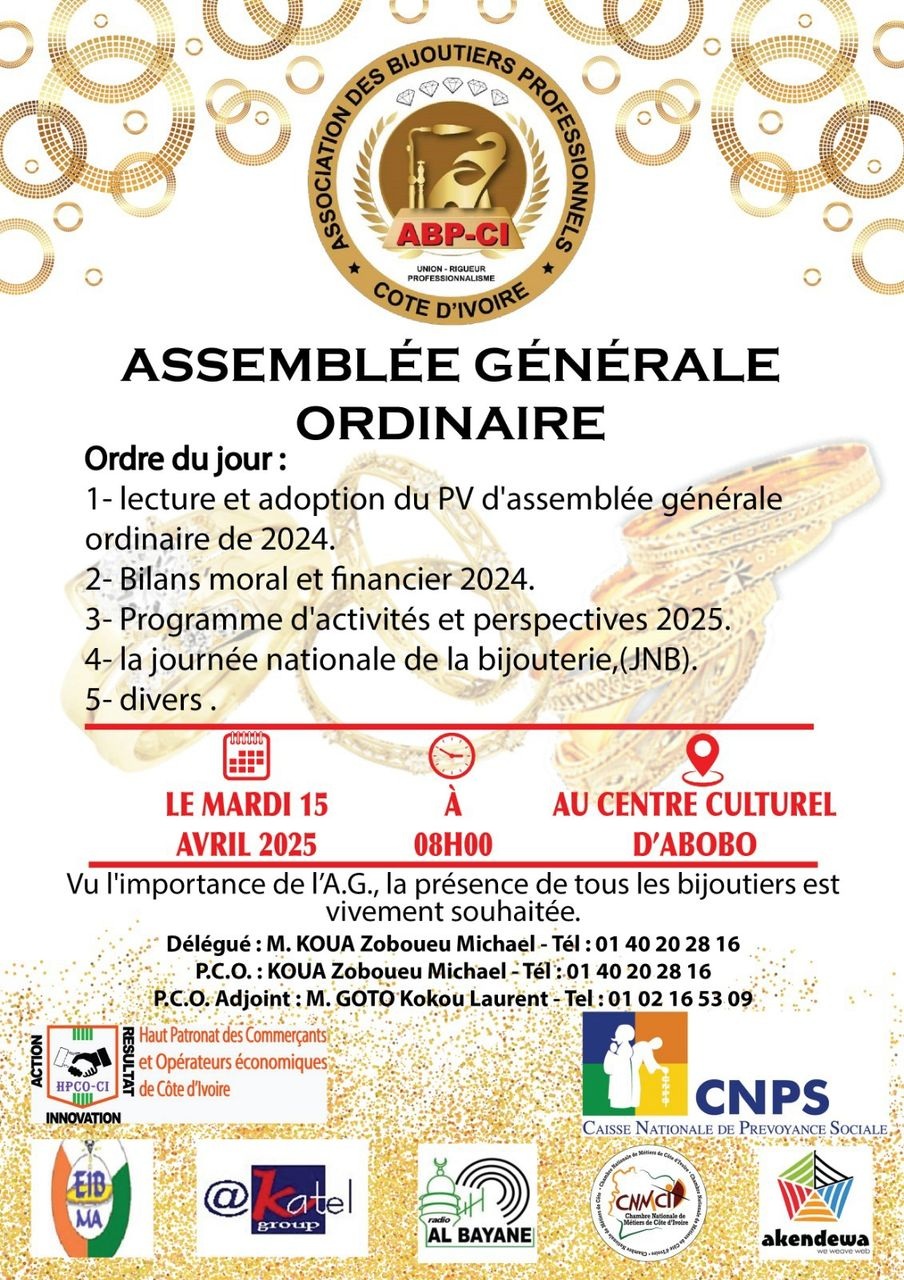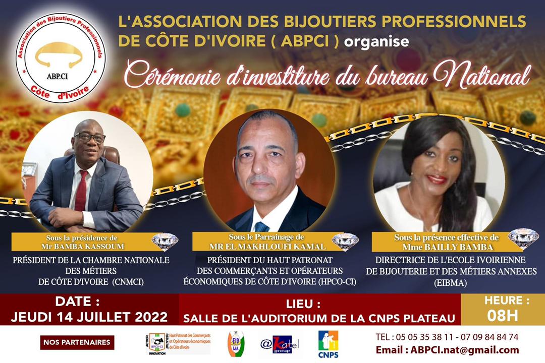 Sur invitation de l’Association des Bijoutiers Professionnels de Côte d’Ivoire (ABPCI). Mme Le Directeur de l’Ecole Ivoirienne de Bijouterie et des Métiers Annexes (EIBMA) prendra part à la cérémonie d’investiture du bureau national de ladite association.