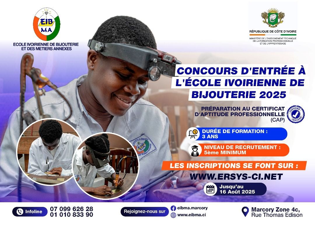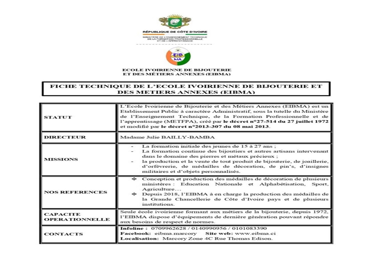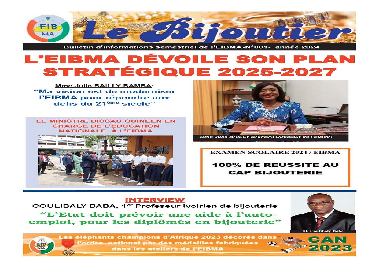 Aujourd’hui, L’EIBMA amorce une nouvelle ère inspirée de la vision et de la volonté de Monsieur le Ministère de l’Enseignement Technique, de la Formation Professionnelle et de l’Apprentissage. Elle se veut désormais une école, un atelier de bijouterie; en somme une industrie du beau dans le quotidien des Ivoiriens, des Administrations, des Institutions, des organismes nationaux et sous-régionaux.